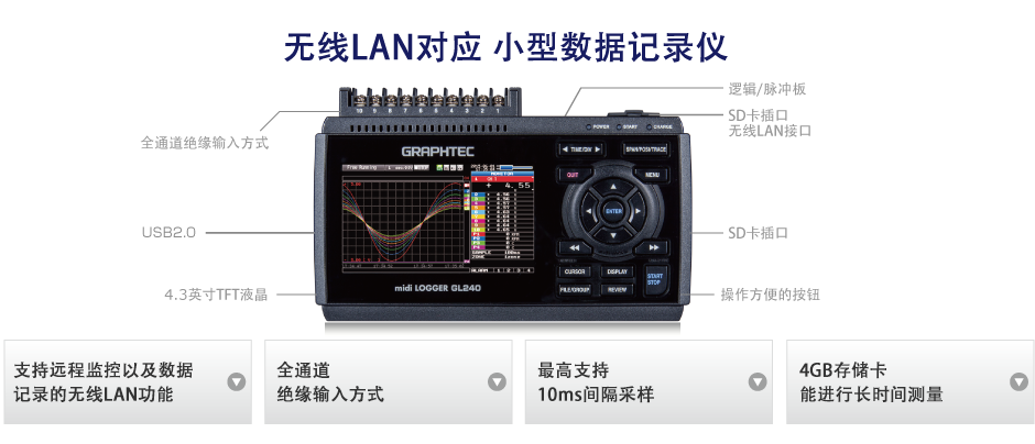 標配4GB的SD存儲卡進行可信性高的長時間的測量 標配4GB的SD存儲卡,收錄的數據文件為GBD或CSV格式。